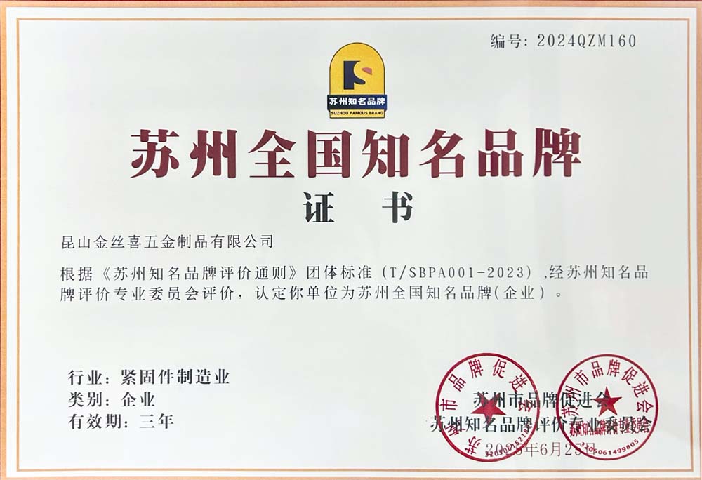 KunshanJinsixiMetalware Co., Ltd. đã được chính thức trao danh hiệu "Thương hiệu nổi tiếng quốc gia ở Tô Châu" vì chất lượng sản phẩm tuyệt vời, sức mạnh công nghệ hàng đầu, hệ thống dịch vụ toàn diện và ảnh hưởng thị trường rộng lớn!